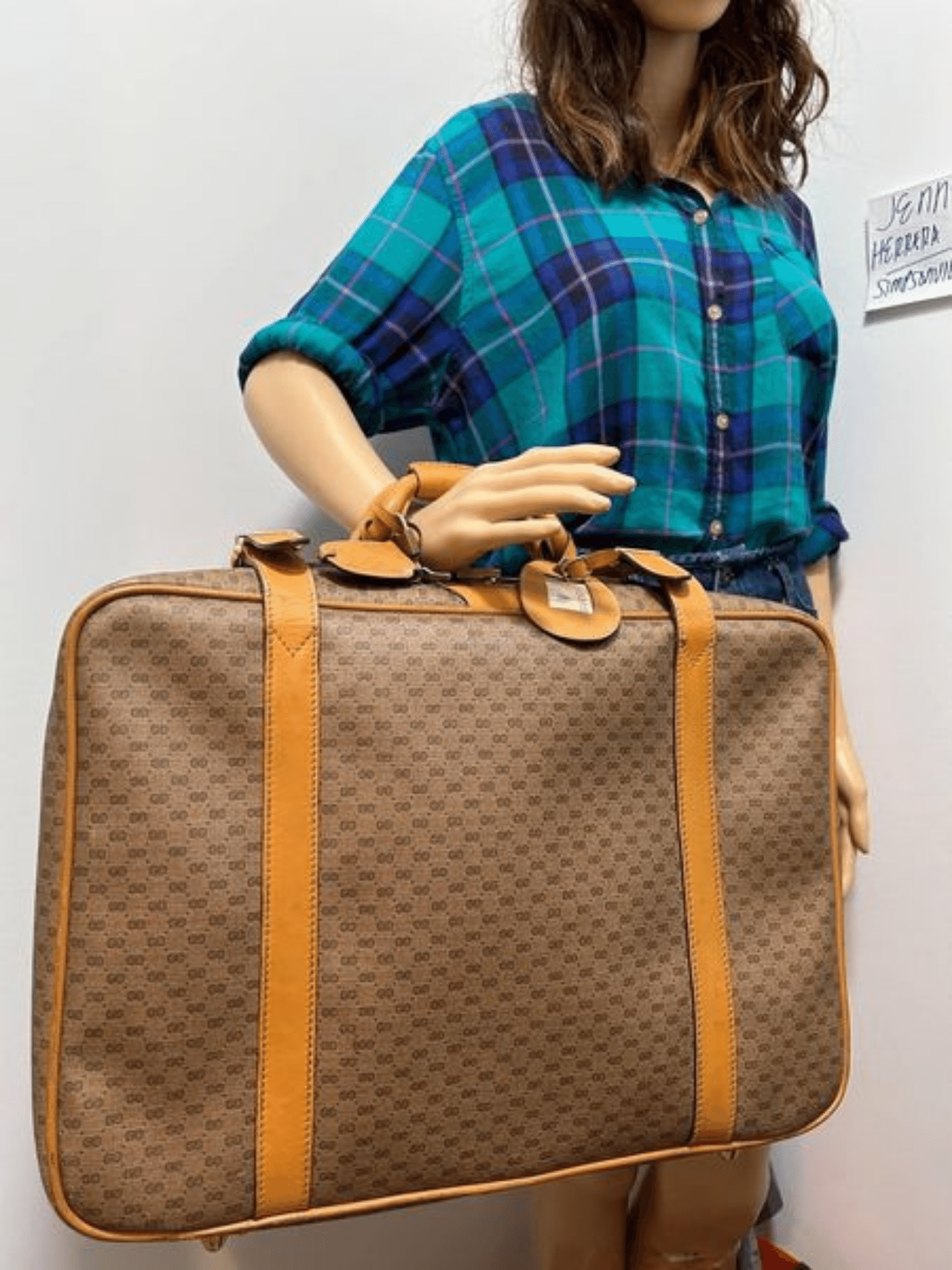 Canvas has scuffing, rubbing. Marks, rubbings on the leather. There are some stains inside, no unpleasant smell. Comes with padlock, keys and luggage tag.
